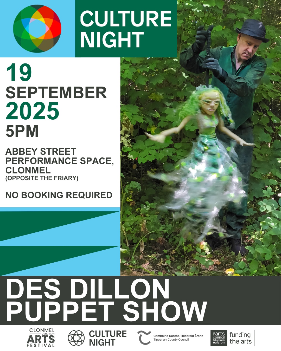 A special interactive performance of Des Dillon Puppet Show for Culture Night at the new performance space on Abbey Street in Clonmel. The audience will have the opportunity to work with fish, birds and animal puppets, followed by a performance of Des Dillon’s Puppet Show with a combination of small and large-scale puppets. Organised by Clonmel Junction Arts Festival the event will conclude with a community performance with members of the public each taking a puppet and performing with Des in a celebratory finale with music, movement and dance.