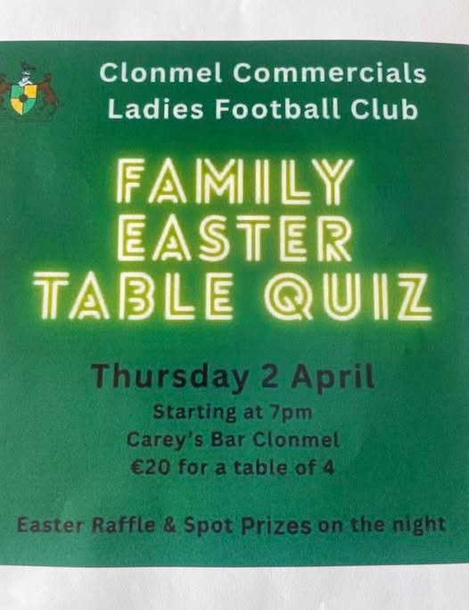 Raffle and spot prizes on the night. €20 for a table of 4.