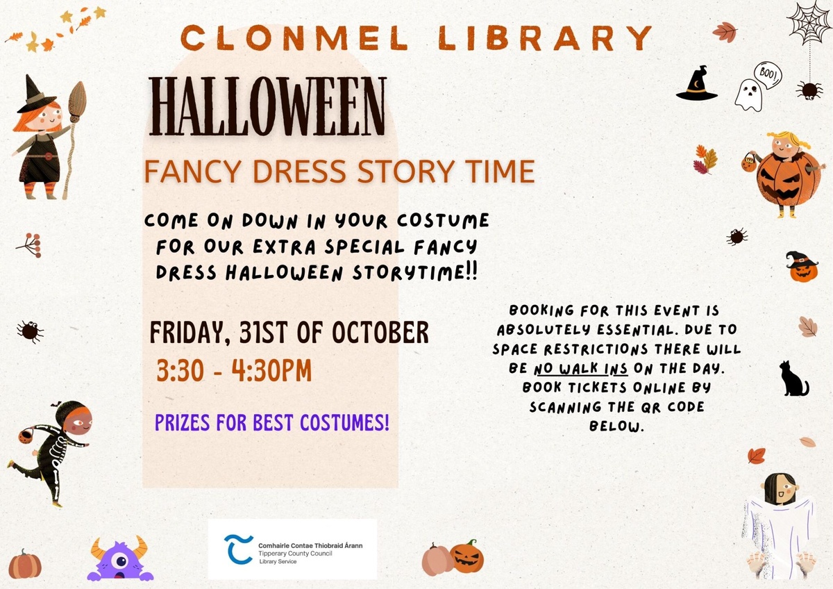 Booking for this Event is absolutely essential. Book tickets online: https://www.eventbookings.com/b/event/halloween-fancy-dress-storytime-at-clonmel-library