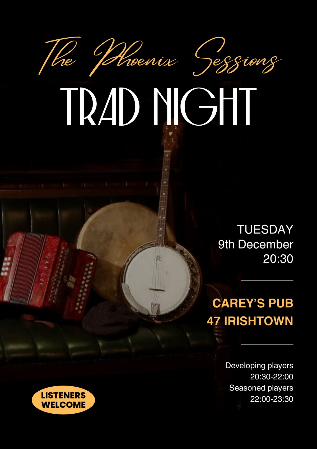Trad night. Developing players 20:30–22:00, seasoned 22:00–23:30. Listeners welcome